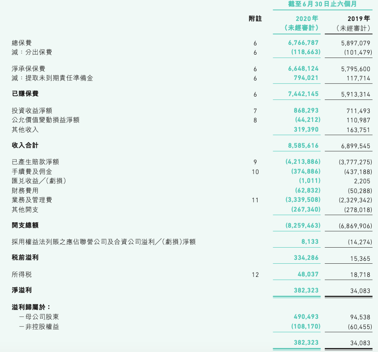 26日,众安在线(6060.HK)发布2020年中期业绩。上半年,众安在线收入合计85.85亿,同比上涨24.4%;净利润约3.8亿,同比上涨10倍,除去非控股权益后归母公司股东净利润录得4.9亿,同比上涨421%。