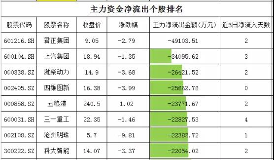 个股资金净流出方面,君正集团净流出近5亿元,上汽集团净流出超过3.4亿元,潍柴动力和四维图新净流出在2.5-2.7亿元。