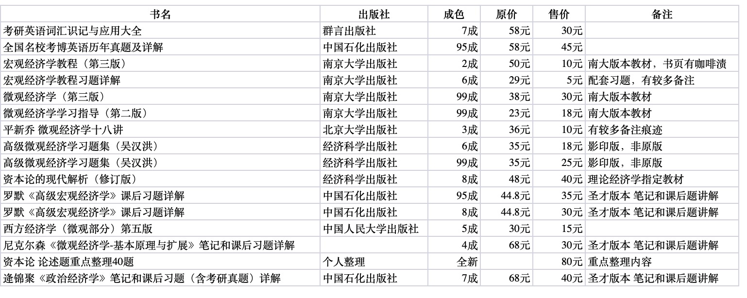 有幸被南京大学经济学院理论经济学专业博士录取,深知复习备考过程不易,出掉一些复习时用到的资料回血,也希望能帮到有需要的朋友(距离近包邮,远距离的朋友抱歉只能到付),价格可以轻微小刀,不接受屠龙宝刀哦。 可以为购书的朋友介绍南京大学考博相关的信息和经验(限个人范围以内)。