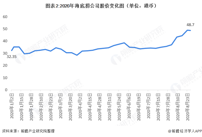 通过对海底捞公司2020年以来股价的变化统计,海底捞公司的股价收盘价从2020年1月2号的32.35港币上涨到2020年8月27日的48.7港币,股价涨幅超过50.5%。2020年上半年受到疫情的影响,在停业期间,餐饮企业在丧失现金流来源的情况下仍需要承担人力成本和租金成本两大刚性支出,缘何在整个行业亏损的情况下,龙头海底捞股价仍保持逆势增长?