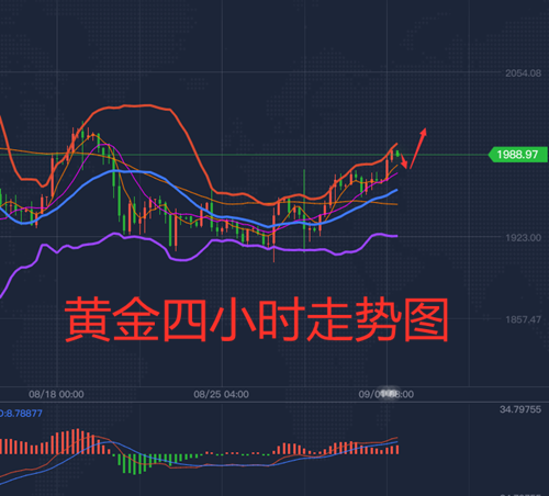 黄金走势解析:黄金4小时来看,黄金延续震荡上行的趋势,昨日回调后进入震荡拉锯。布林道呈开口向上,金价位于上轨附近,MACD交金叉,红色动能柱基本持稳,上涨趋势明显。今日早间从1968附近持续上涨至1988附近。综合来看,操作上建议回调低多为主,短期关注上方阻力1995-2000一线,下方支撑1985-1982一线。