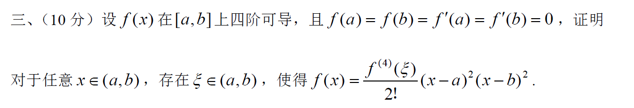 $\displaystyle \therefore f(x)=\frac{f^{(4)}(\xi)}{2!}(x-a)^2(x-b)^2.$
