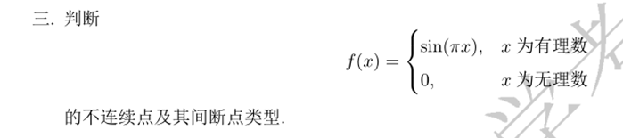 此时,极限不存在。由此可知在$\displaystyle x\neq n,(n=0,\pm 1,\pm 2,\cdots )$时,函数不连续。因为