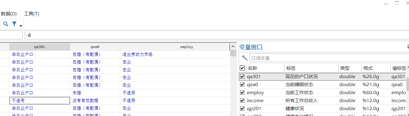 请问是因为qa301的类型是double型吗,该如何转换为字符型或者删除显示不适用的样本?