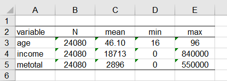 logout, save(table) excel replace:tabstat age income metotal, s(N mean min max) f(%12.2f) c(s)
