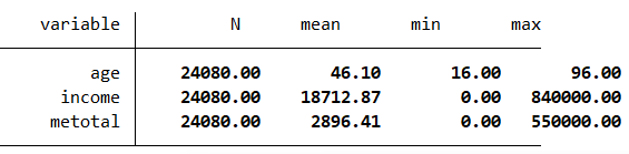 tabstat age income metotal,s(N mean min max) f(%12.2f) c(s)