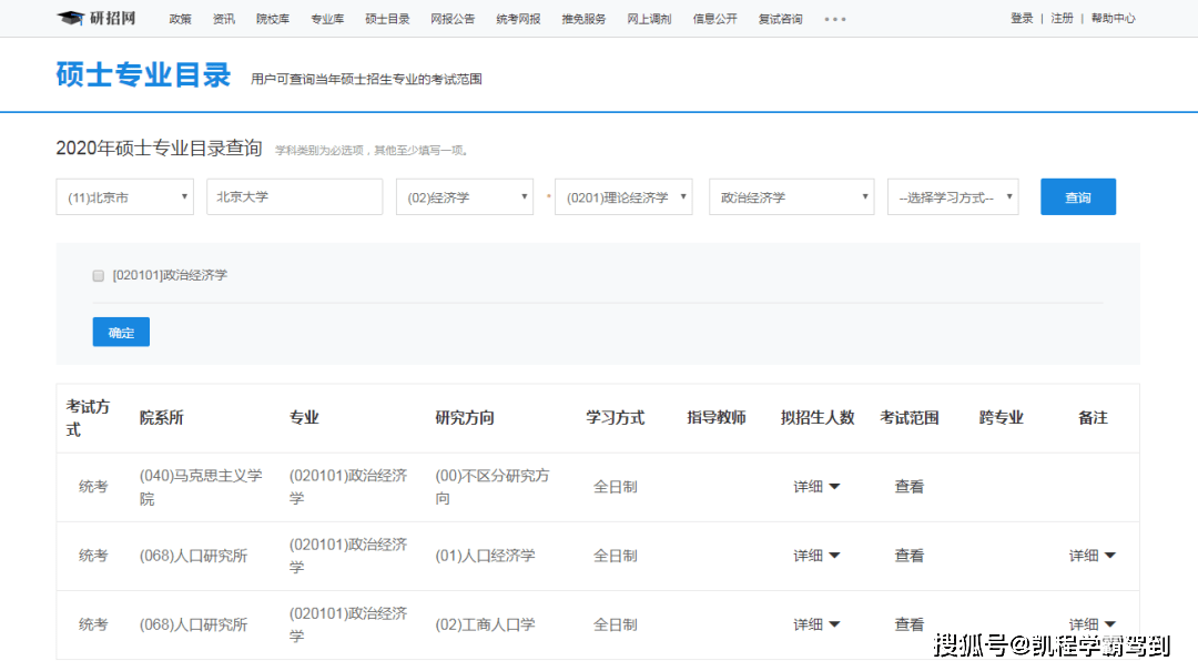 点击一个招生单位后,你可以看到该招生单位一级学科下设置的专业,有哪些研究方向,是全日制还是非全日制;可以查看拟招生人数。