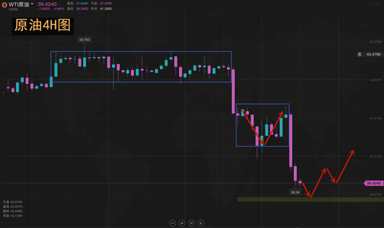 4小时伴随连阴惯性的下探后出现双连阴反弹,由于均线指标还未拐头,所以短线迂回向下,目前看不像极弱的走法。不过考虑到近期所有关键支撑42.0和41.0都已经跌破,也就意味着油价目前的跌势还有下跌的空间,小周期暂时偏弱,因此日内短线亚欧盘先在41.8临界点之下反弹看空,下方着重关注40争夺。综合来看操作短线思路上夏黛清个人建议以回调做多为主,反弹高空为辅。