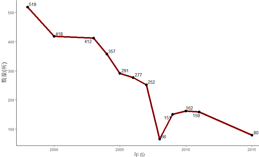 ggplot(school,aes(year,number))+geom_line(size=2,colour="darkred")+geom_point(size=3)+xlab("年份")+ylab("数量(所)")+theme_classic()+