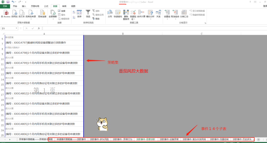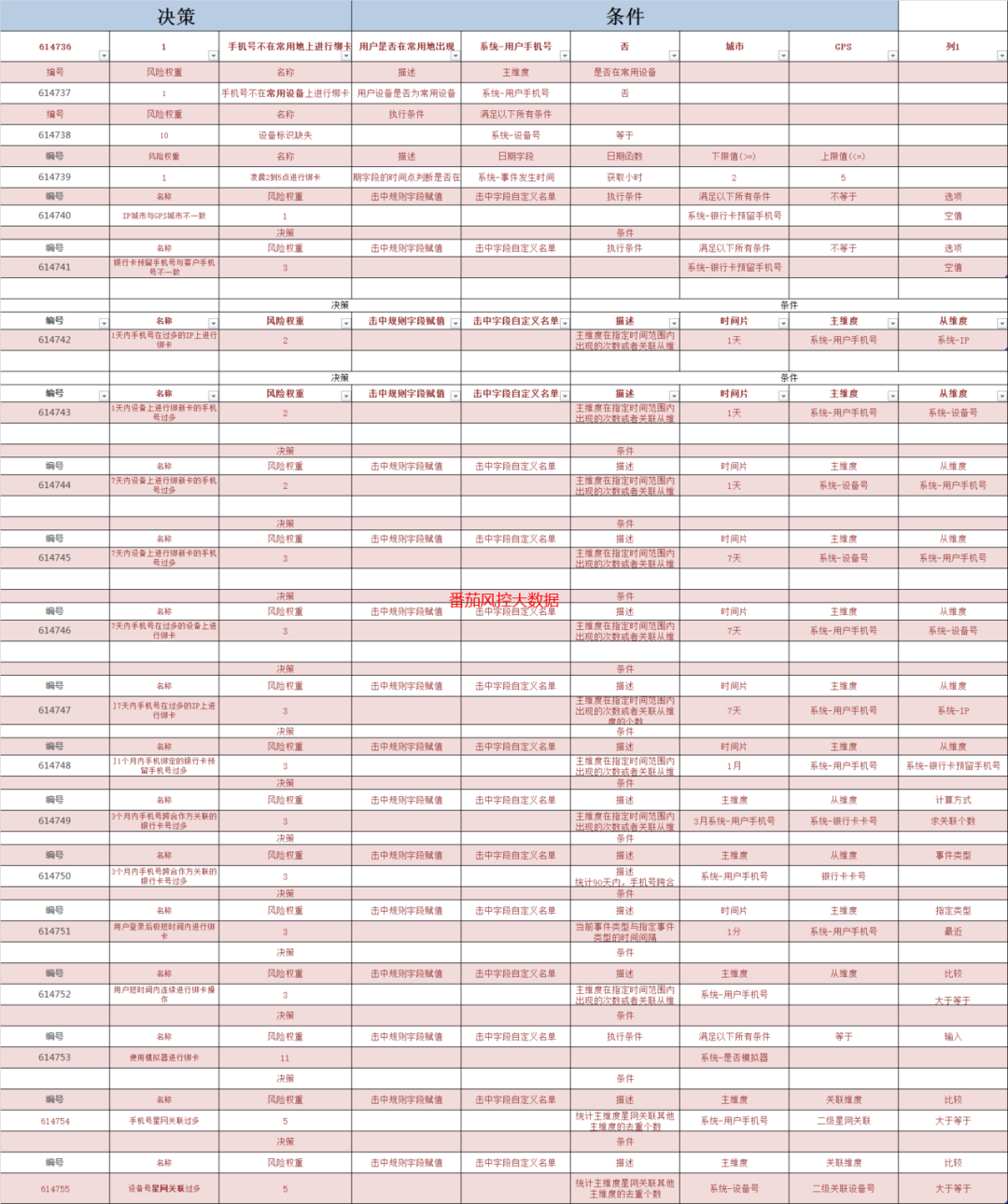 在本次分享的内容中,如贷款事件就有:多头风险/异常行为/恶意贷款/设备异常/复杂关系网络/流量控制/历史多头名单/历史安装应用统计策略/失信风险多头风险比对/联系人风险名单比对/GPS区域风险检测,十四个行为居多。话不多说,直接看表:
