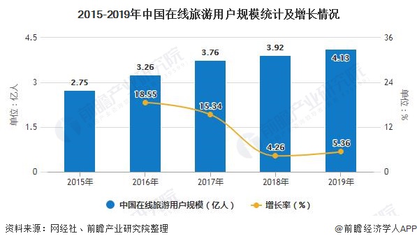 2019年在线旅游用户规模达4.13亿人,同比2018年3.92亿人增长5.36%。而2015-2017年的用户规模分别为2.75亿人、3.26亿人、3.76亿人。