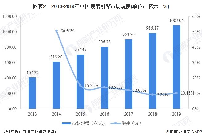 目前,我国搜索引擎行业经过一段时间的高速发展期后,迎来稳定发展阶段。2014年,行业市场规模增速高达50.56%,达到近几年增速峰值;随后几年,行业发展增速逐步下滑,至2019年,中国搜索引擎市场规模达1087.04亿元人民币,同比增速达10.15%,增速小幅回升。