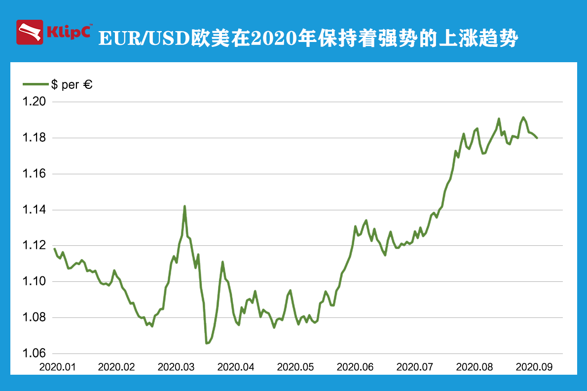 据KlipC分析,面对COVID-19危机,美国央行将利率降低至接近零的举措降低了持有美元资产的吸引力。美联储上个月向平均通胀目标的转变进一步削弱了美元,并加大了欧洲央行的压力,并且要求欧洲央行做出自己的战略评估,该评估将于明年完成。
