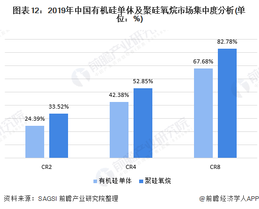 数据分析得出,2019年我国有机硅单体CR4达42.38%,CR8达67.68%,聚硅氧烷CR4达52.85%,CR8达82.78%,行业的市场集中度较高。