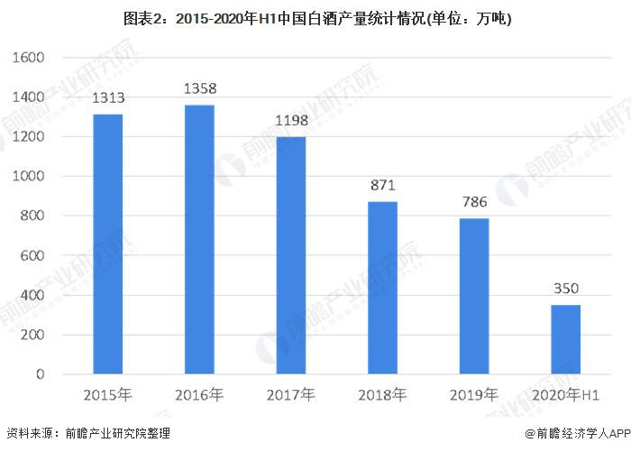 2012年12月,《中央军委加强自身作风建设十项规定》要求:接待工作不安排宴请,不喝酒,更是对军队接待工作中饮酒亮出了红牌。之后,各地方ZF又陆续出台地方版“禁酒令”。中国白酒行业前期积累的产能过剩、社会库存过大等问题快速爆发,白酒行业进入调整期,全行业产量增速大幅下滑,但我国规模以上白酒企业的产量直至2016年仍保持了正向增长,达1358万吨。经过前期深度调整以及消费升级推动,分化发展成为2016年以来白酒行业的总体特征,落后产能持续出清,白酒行业整体产量持续减少。2019年,白酒产量已下降至786万吨,2020年上半年,白酒产量只有350万吨,预计2020年全年产量在700万吨左右。