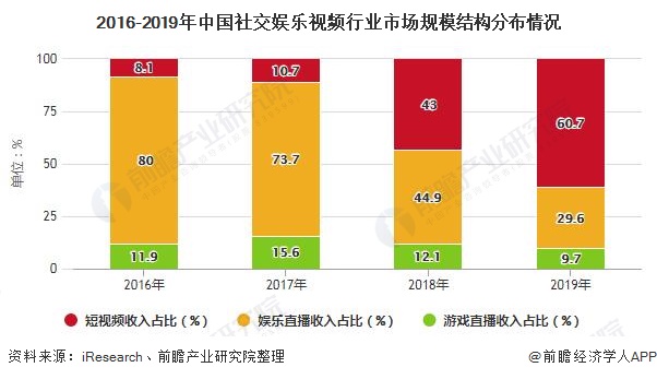 社交娱乐视频行业在实现流量快速积累的同时,也在不断尝试各种内容的商业化变现。从社交娱乐视频行业市场规模结构来看,短视频收入逐渐代替直播尤其是娱乐直播成为主要收入来源,2019年占比为60.7%,这主要得益于短视频广告营销收入和电商收入的快速增长。