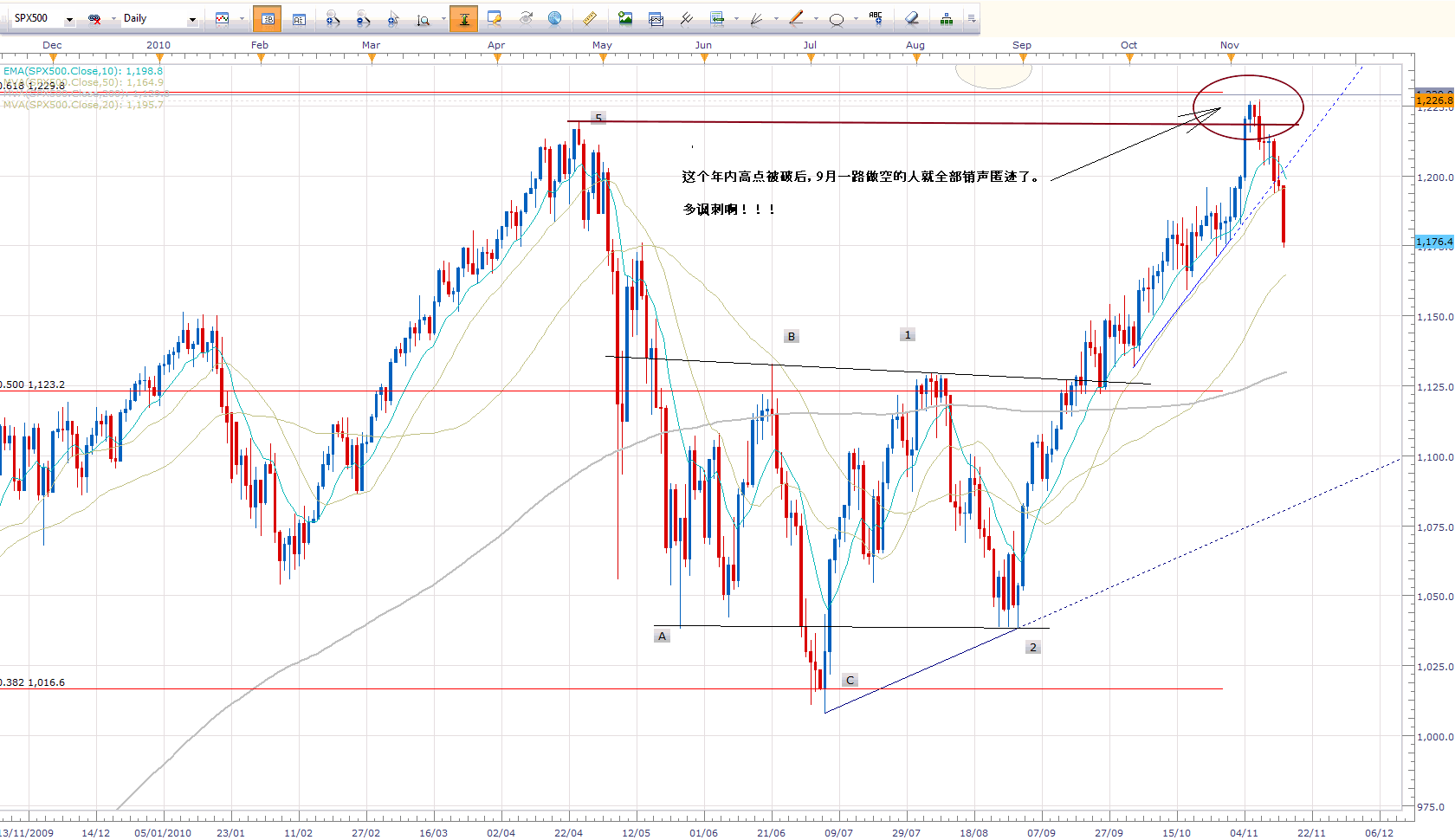 随后没有人做空了,11月9号牛熊指标显示只有20%的人看空。然后没有人再做空,上方没有了止损单后市场也不再上涨。而所有看多的人都做多了,没有新的做多力量,市场失去了上升的动力。