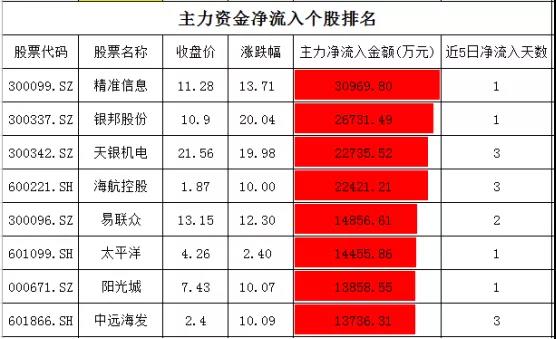 个股资金净流入方面,精准信息净流入近3.1亿元,银邦股份、天银机电和海航控股净流入在2.2-2.7亿元。