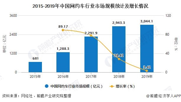 2019年,2019年,我国网约车用户规模达4亿人次,使用率为47.3%;行业的市场规模达3044.1亿元,同比增长3.42%。