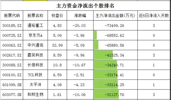 个股资金净流出方面,通裕重工净流出超过7.3亿元,京东方A、中兴通讯净流出在6.5-6.9亿元,露笑科技净流出超过4.1亿元。