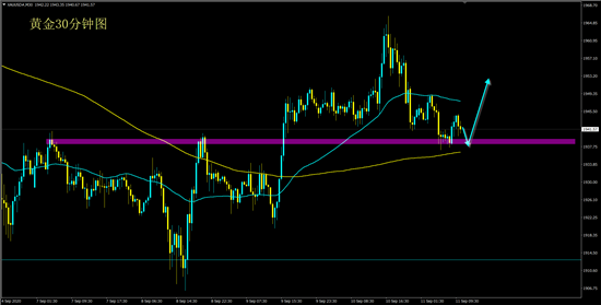 昨日黄金先涨后跌,最后日线以十字星收盘,今日亚盘行情遇阻1950压力后再次回落至1937位置,欧盘行情反弹,日内整体维持十美金上下波动。从当前走势上来看,黄金依然是区间内的反弹行情,30分钟走势图上,K线一直处于均线上方,1小时级别,短期均线上穿长期均线形成金叉。如果今日能站稳在1940上方,那么接下来还是继续涨。