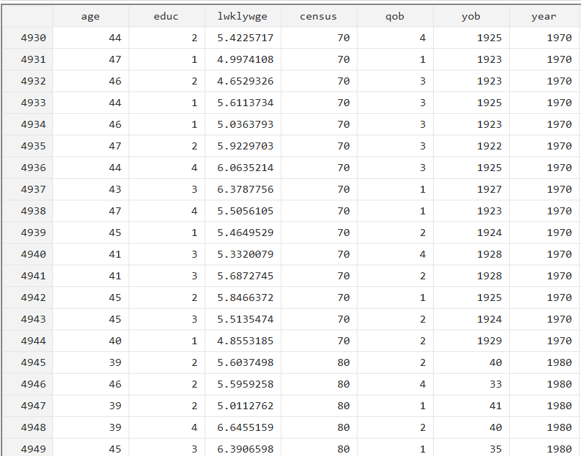 数据的一部分如下,1970和1980年的数据append在一起(因各自年份观测对象不同故用append没有merge),educ定义成了分类变量,有1,2,3,4四类分别代表不同的教育水平。问题:检验1970年中教育水平为4的人群占比与1980年中教育水平为4的人群占比是否一致 求大佬们解答