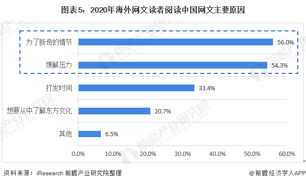 2020年海外网文读者阅读中国网文的原因主要是为了新奇的情节和缓解压力,其中56%是为了新奇的情节,54.3%是为了缓解压力,打发时间占33.4%,了解东方文化比重为20.7%。
