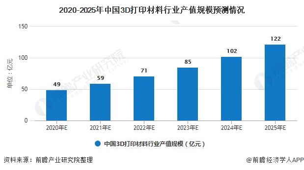 我国《“十三五”材料领域科技创新专项规划》提出到2020年,要实现80%以上材料国产化,3D打印材料市场将会面临巨大的发展空间。根据我国3D行业需求的不断发展及3D材料在3D产业中的占比,前瞻产业研究院估计,2020-2025年我国3D打印材料产值将保持20%以上的平均复合增速,到2025年,产值规模将达到122亿元左右。