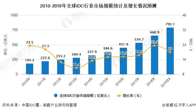 据中国IDC圈的数据显示,2010-2018年间,全球IDC市场规模均保持正增长,且年均增速在20%左右;2019年,全球IDC行业的市场规模约逼近800亿美元大关。