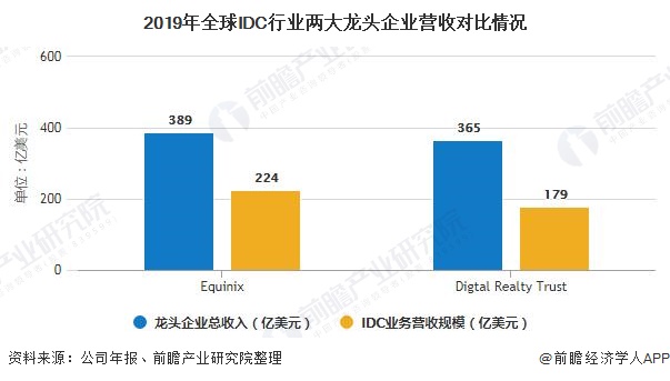 具体从全球IDC行业的龙头企业-Equinix、Digital Realty Trust来看,2019年,两家公司分别实现营收389亿元和365亿元。其中,Equinix在IDC业务方面实现营收224亿元,占总营收比重的57.6%;Digital Realty Trust在IDC业务方面实现营收179亿元,占总营收比重的49%。因此,从营收情况来看,Equinix占据优势。