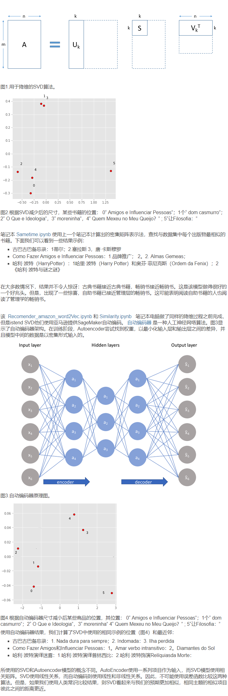 所述 SparkRecomendation.ipynb 笔记本中使用的火花框架应用SVD以减少矩阵的维数。结果,同一模型以密集形式表示。请注意,在这个新的向量空间中,相关的书籍或用户应该彼此靠近。图2显示了SVD尺寸缩小后某些书的位置。有可能看到相关项目彼此靠近。1和3是古典书籍,0和4是自助书籍。但是,在某些示例中,预期结果不是使用常识时所期望的结果。2和5是关于哲学的书,彼此之间并不接近。也许是因为一种对于普通读者而言更多,而另一种对于专业人士而言。