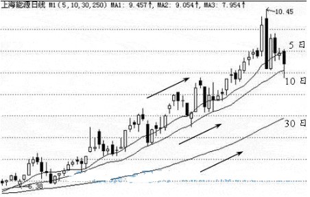(2)、在涨势的初期,指5日(或者短期)均线上穿10日(或者中期)均线和30日(或者长期)均线,中期均线上穿长期均线交叉形成的一个尖头向上的三角形。该图形技术含义为见底信号。