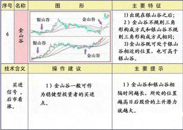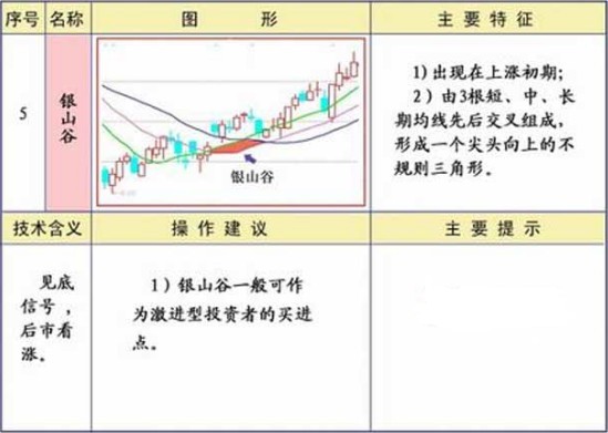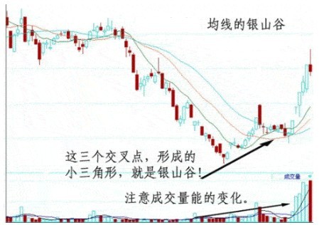 银山谷就是短中线都穿过长线时形成的图形,下边有一个三角,或者是四边形,这里象个山谷,长期下跌后首次出现的山谷,叫银山谷