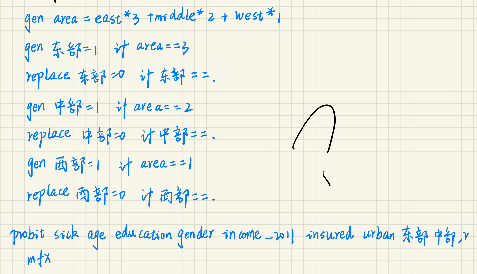 因变量是患病概率,数据中有west、east、middle三列数据,想分别比较东部较西部、中部较西部的患病概率情况,为啥不直接输“ probit sick age education gender income_2011 insured urban east middle ,r”,然后mfx一下,而要如下图输那么多命令呢?
