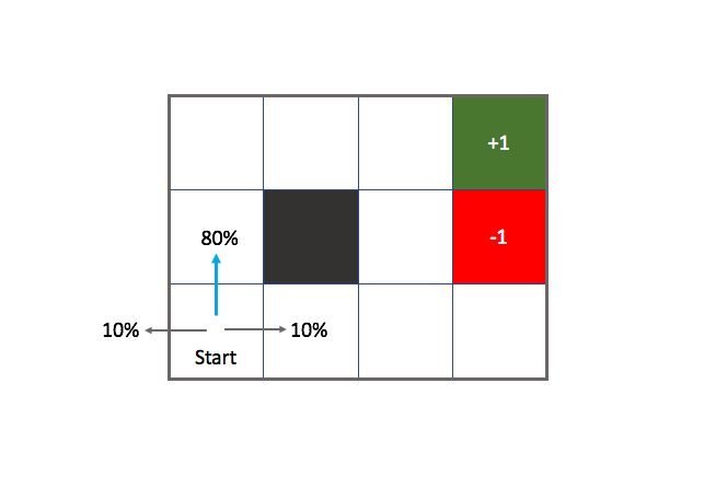 该图中的每个正方形代表一个可能的状态(黑色正方形除外,假设这是一个无限高的势垒)。代理从左下角开始,可以通过以下一组操作从一个状态移动到另一个状态:上,下,左,右。如果该代理位于环境外围的正方形之一上,并试图在环境之外迈出一步,则它只会撞到墙壁上并停留在当前状态。右上角的方块是所需的最终状态,奖励特工+1分并结束“游戏”。右下方的方块也结束了“游戏”,但奖励代理人-1的罚款。