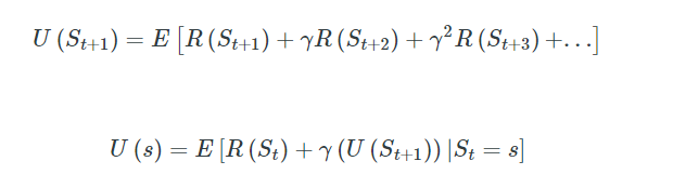 此外,下一状态的值包含随后的无限状态序列的值。因此,我们可以仅根据状态的当前报酬和对以下状态的效用的期望来定义状态的效用。让我们看看它是如何工作的。