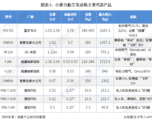 国际上小推力航空发动机代表产品包括:霍尼韦尔的TFE731、普惠加拿大公司的PW500、威廉姆斯国际的FJ44、捷克PBS的PBS TJ150等。