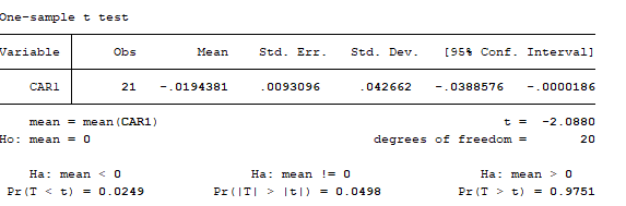 5. **[95% Conf. Interval]**: 这是基于样本估计的平均数的置信区间。如果这个区间不包含零,则表明CAR均值与零有显著差异。