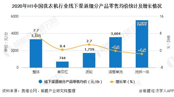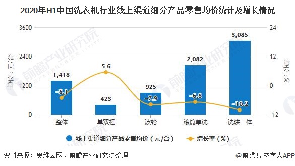 根据奥维云网公布的数据显示,2020年上半年,我国洗衣机线上渠道整体零售均价为1418元/台,同比下降5.1%,其中洗烘一体洗衣机线上渠道均价为3085元/台,同比下降10.2%,降幅最大;线下渠道整体零售均价为3335元/台,同比增长7.7%,其中波轮洗衣机线下零售均价为1739元/台,同比增长2.7%。