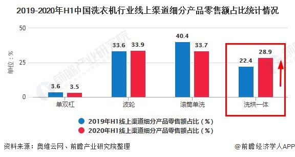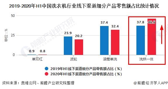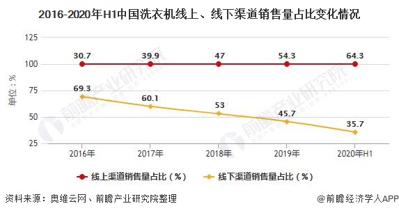 根据奥维云网公布的数据显示,2020年上半年,我国洗烘一体洗衣机市场线上渠道零售额占比为28.9%,同比增长4.5个百分点,线下渠道零售额占比为46.6%,同比增长8.8个百分点。