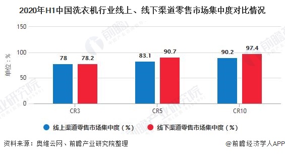 根据奥维云网公布的数据显示,2020年上半年,我国洗衣机行业线上渠道零售市场CR3为78%,CR5为83.1%,CR10为90.2%,行业集中度有所提升,但仍低于线下渠道市场集中度,2020年上半年洗衣机行业线下渠道零售市场CR3为78.2%,CR5为90.7%,CR10为97.4%。