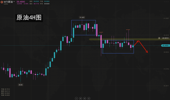 EIA数据利空,但具体走势是先涨后跌,最高在40.7,最低在39.1,虽然上涨破位40.5,但没有站稳持续走高,下跌力度也很大,所以,整体还是保持震荡,依旧在区间之内。目前价位在39.6,由于区间没有拉开,周四继续看震荡区间交易,技术面内的H4周期区间范围很明显,高低区间在40.2/38.8,在高低重点点位交易即可,全天有效,美盘拉开区间的可能性也不大,短线积累这波利润空间。