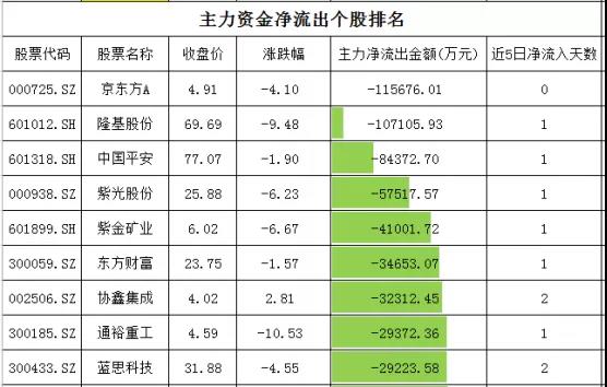 个股资金净流出方面,京东方A、隆基股份净流出在10-12亿元,中国平安、紫光股份、紫金矿业净流出在4.1-8.5亿元。