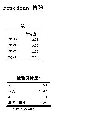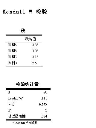 应采用“非参数检验”中的“K个相关样本”检验。检验的结果是20个人对4种不同饮料的评价无差异(P值为0.84>0.05)。具体见图。第二个图中可同时选中“Friedman”复选项和“Kendall's W”复选项。