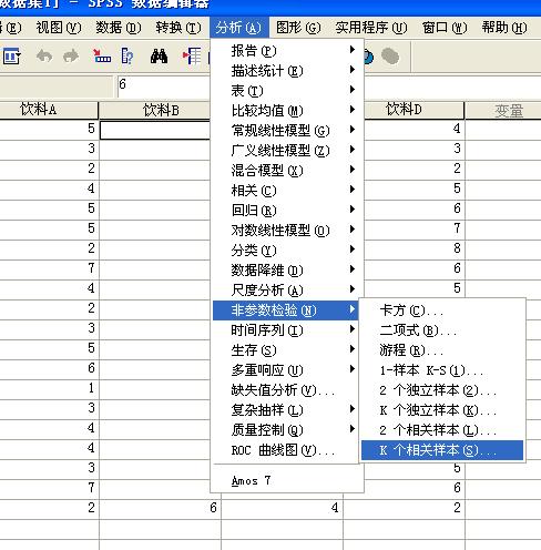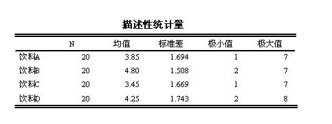 比如,像下面20个人对4种饮料评价好喝不好喝,1-7分,这4种饮料的的结果差异怎么检验?有哪位大侠帮忙解答下~~