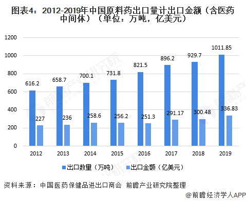 近年来我国原料药出口规模持续扩大,根据中国医药保健品进出口商会公布的数据显示,2019年,我国原料药出口量迈入千万吨级门槛,达到1011.85万吨,同比增长8.83%,出口均价同比上涨3%,表现为量价齐升的良好态势。