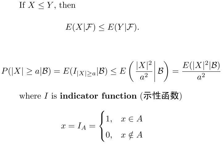 sortout 发表于 2010-12-9 09:44 眼角的伤痕 发表于 2010-12-9 03:13 那个91页的公式我找到了!但是接下来怎么证明啊?我一点也不会,这个作业要算20分!对来说这20分太重要啦!啊啊!能不能给解一下,截图给我看啊,大侠 12# sortout Durret Probability: theory and examples 4th edition P 226 Theorem 5.1.2 (b) If X ≤ Y, then E(X|F) ≤ E(Y|F). P(|X|>=a|B) = E(I_{|X|>=a}|B)