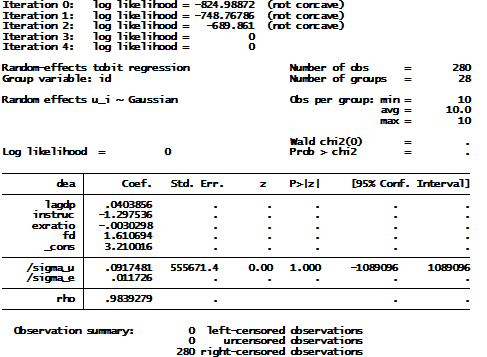 自己第一次使用tobit, 本是想套用dea-tobit两步法写一篇论文,结果发现gls方法得到的结果还好,但xttobit, ul(dea|1)后就成这个样子了~
