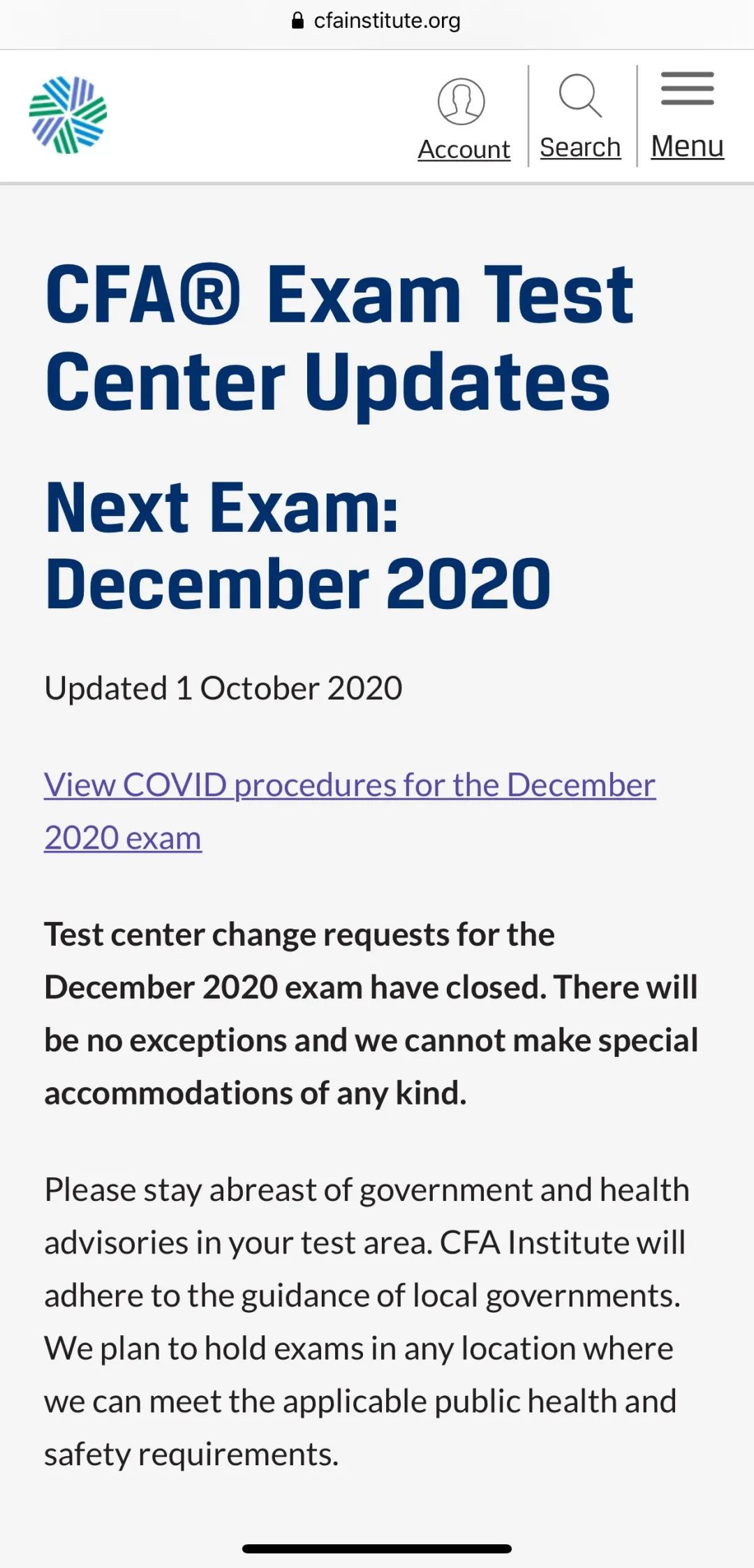 最近虽然是放假,但是CFA和FRM协会的官网都更新得特别频繁,让处于休假中的小编特别焦虑,每天都要去官网认真读一读看一看,毕竟协会之前表示从10.1开始,他们会陆续考量各个考场12月是否有能力举办考试,如果确定无法举办的他们会陆续发出通知。