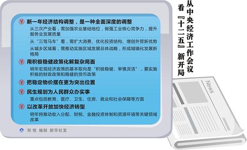 12月12日闭幕的中央经济工作会议提出:2011年宏观经济政策的基本取向要积极稳健、审慎灵活,重点是更加积极稳妥地处理好保持经济平稳较快发展、调整经济结构、管理通胀预期的关系,加快推进经济结构战略性调整,把稳定价格总水平放在更加突出的位置,切实增强经济发展的协调性、可持续性和内生动力。